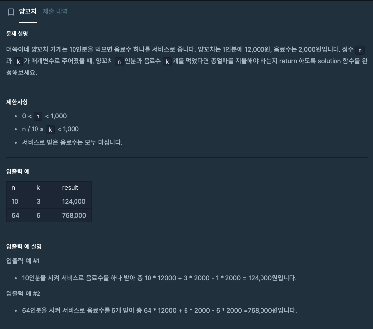 answer 에는 양꼬치 개수 * 1인분 가격 + 음료수 먹는 개수(k),