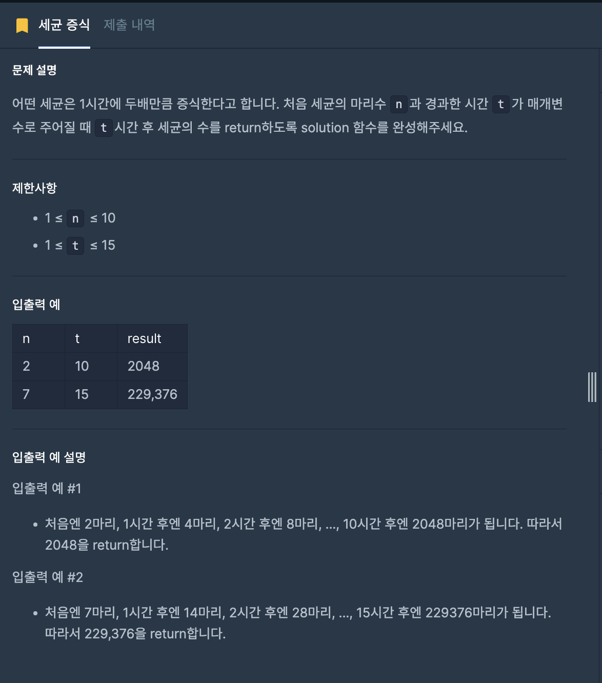 맨 처음 파라미터값 n(세균 증식수), t(경과 시간) 이라는 값으로 주어진다.