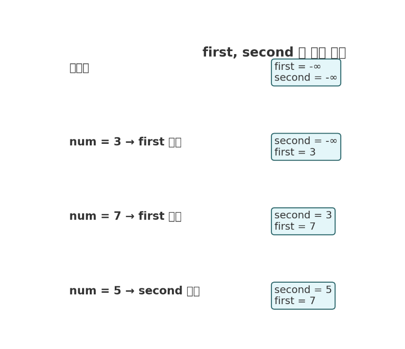 그 다음 num=7이 들어오게 되면 자연스레 3은 second자리에 밀려나는 형태이다.