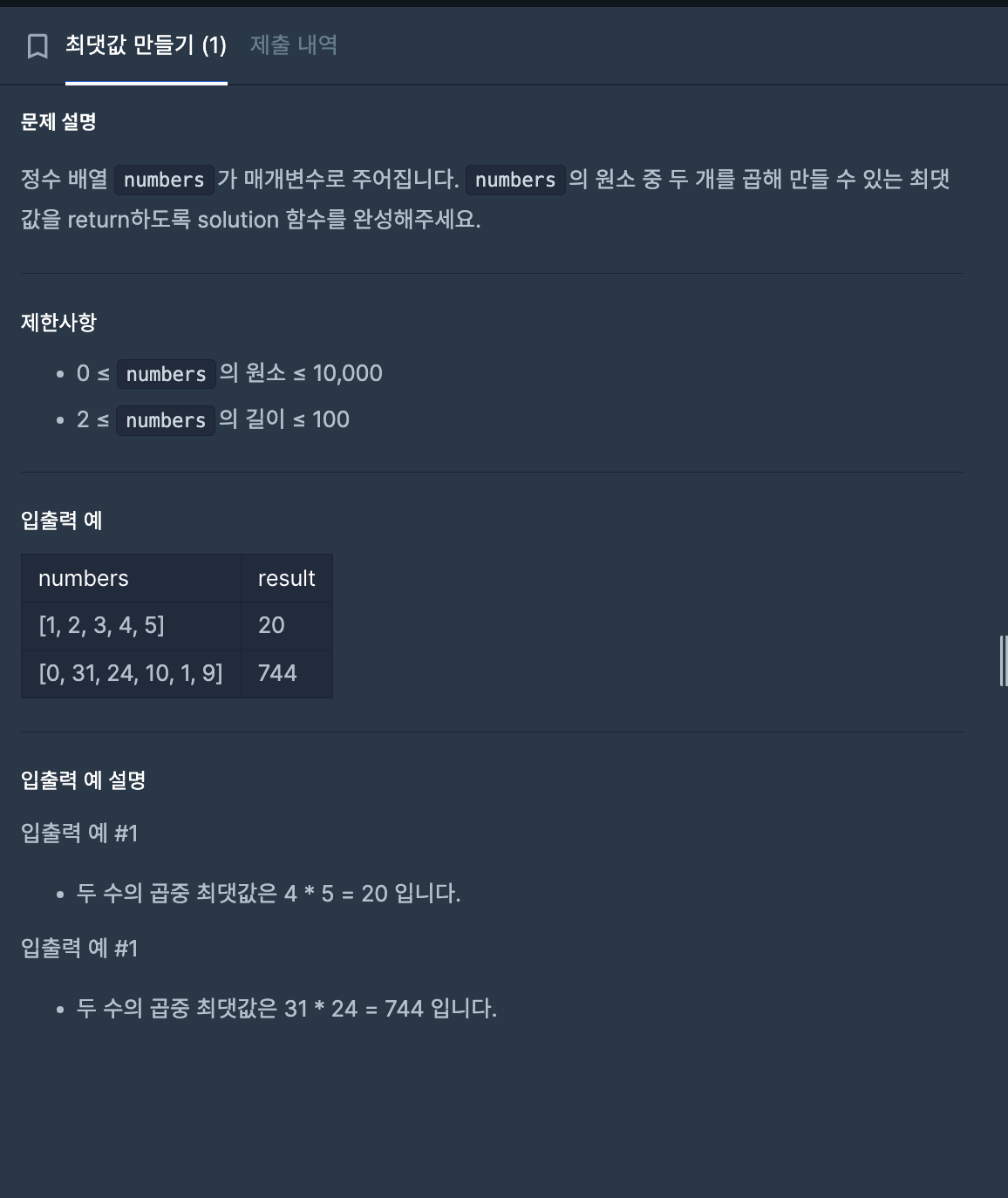 입출력에서 보면 알듯이 두 수 곱의 최대값이 나와야하기 때문에 파라미터는 두개를 생성해줘야한다.