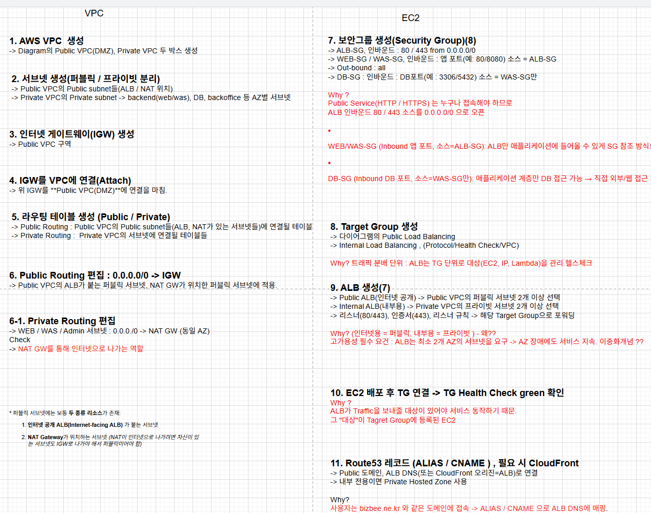 위의 사진은 저 단계별로 할 수 있도록 규칙을 주고 진행을 하였다. EC2의 보안그룹 생성부터 TG, ALB 생성은