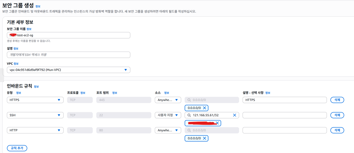 SSH 쪽은 만들고자하는 EC2 (목적지) 나의 공인 IP (출발지) 가 되어야하기 때문에 22 포트로 개방하였다.