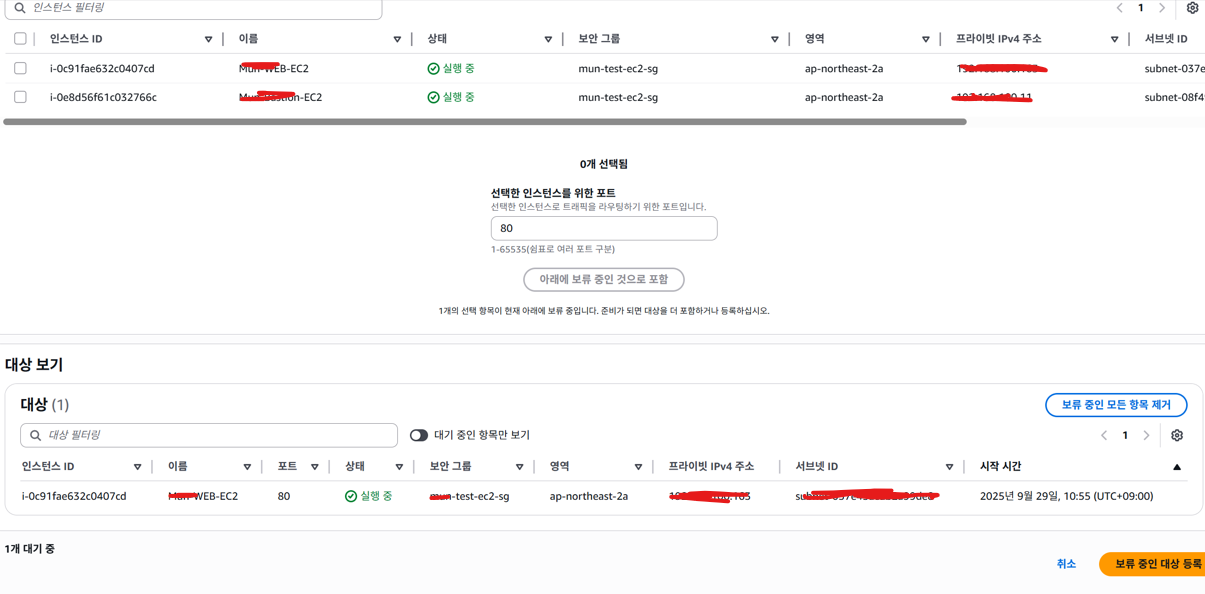 9. 7-1 대상 그룹을 만들지 못했던 인스턴스를 가져와서 보류 중인 대상으로 등록을 한다.
