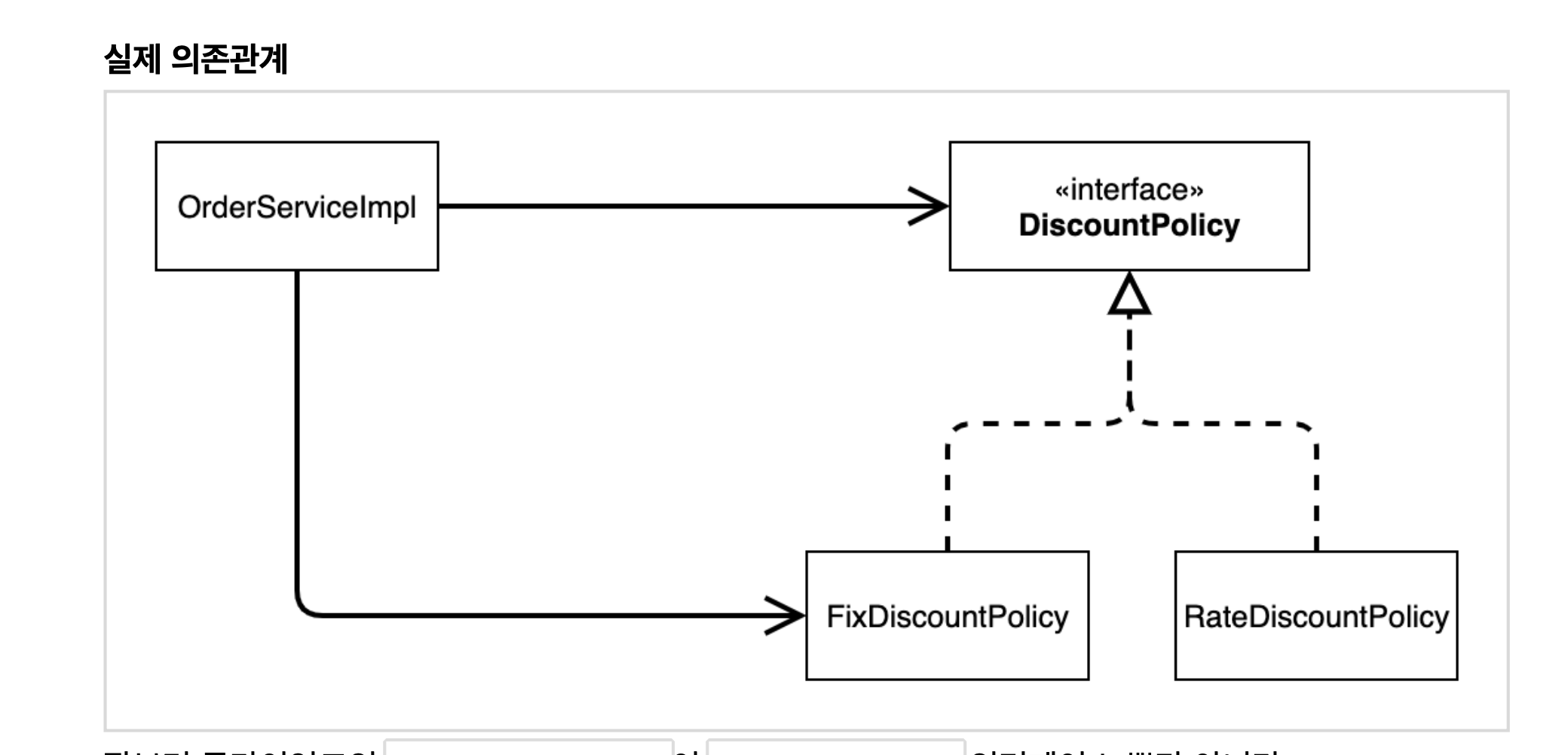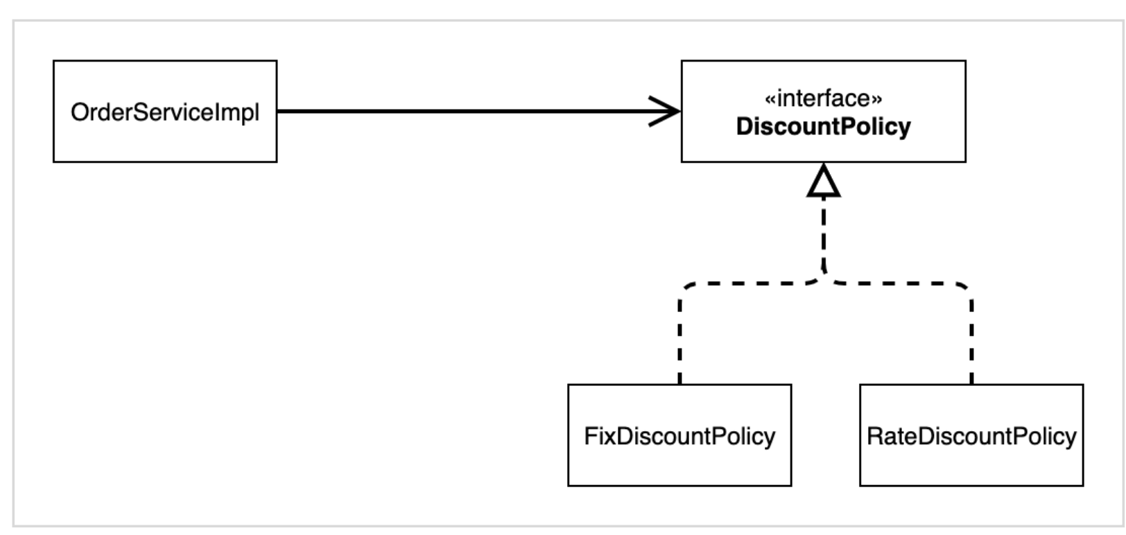 그렇게 되면 우리는 인터페이스에만 의존할 수 있도록 나타내야 할텐데, DiscountPoliy라는 인터페이스만 바라볼수 있도록 만들어줘야한다. 그래서 객체로 만든 FIxDiscountPoliy(), RateDiscountPolicy()를 만들어놓는것이 아니라 DiscountPolicy만 만들어 놓게 해야한다. 여기까지 좋다. 그런데 문제가 있게 되는데 저런식으로 돌리게 된다면 Fix,Rate에 비즈니스로직이 있기 마련인데