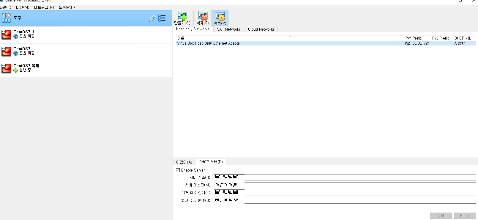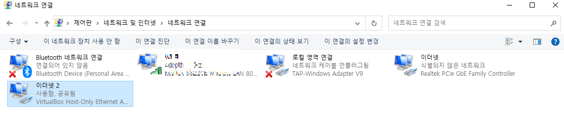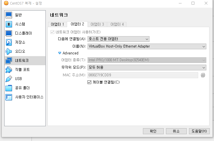 네트워크 또한 호스트 전용 어댑터로 변경해야하며,